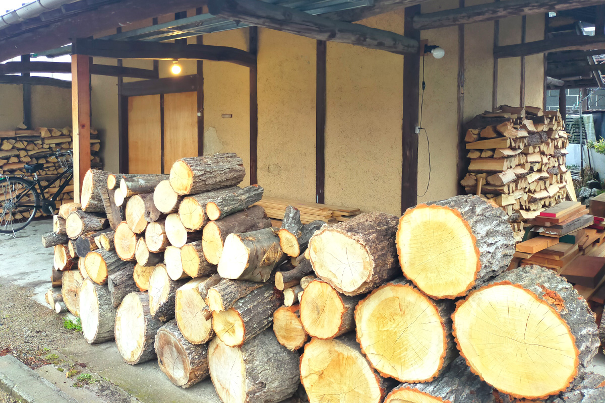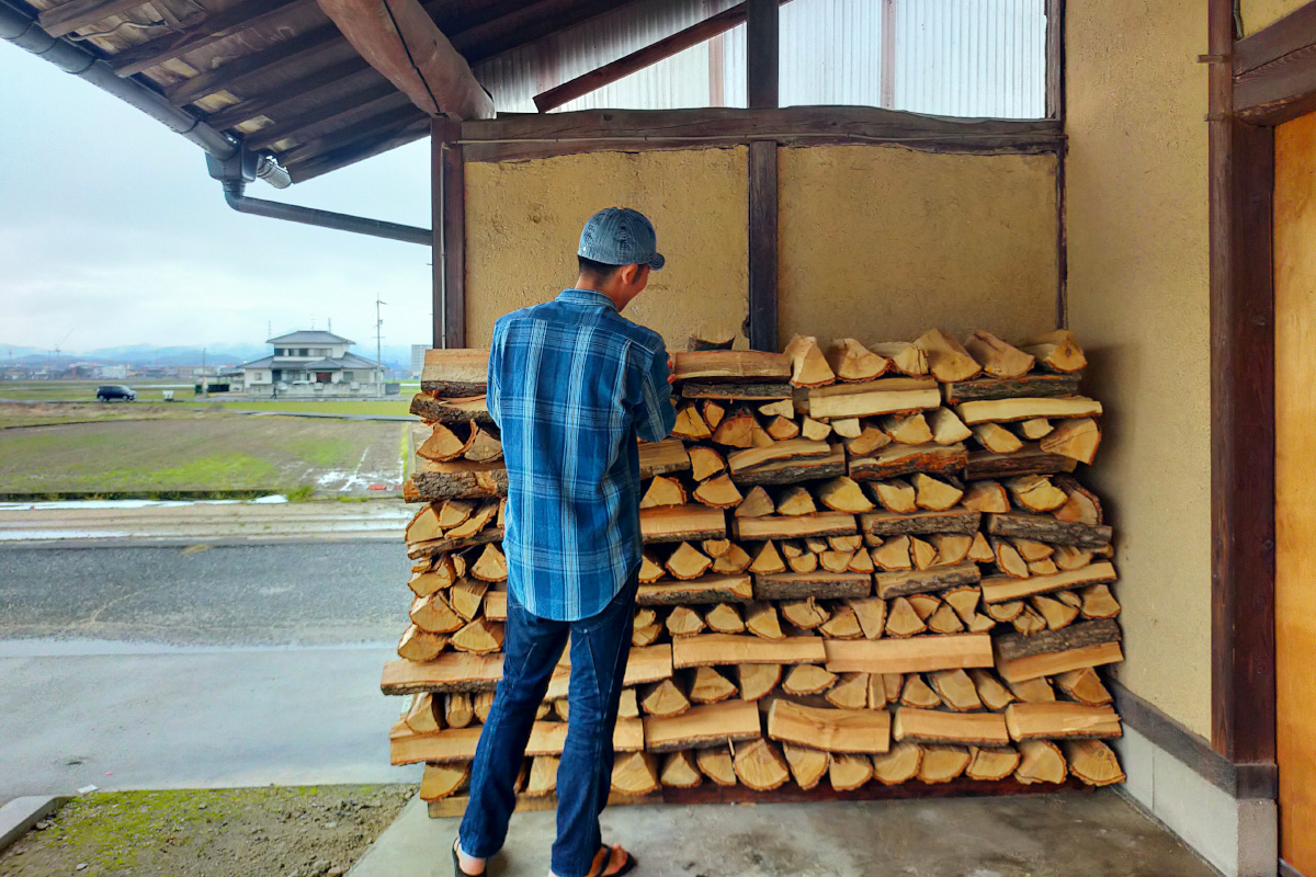 「薪ストーブで使う木は、1年間乾かした木なんです。10月~3月の木の水分が少ない時期に山で木を切り、玉切りの状態で運んできます。その木をくべられるサイズに薪割りし、1年間乾かします。」と教えてくれた。