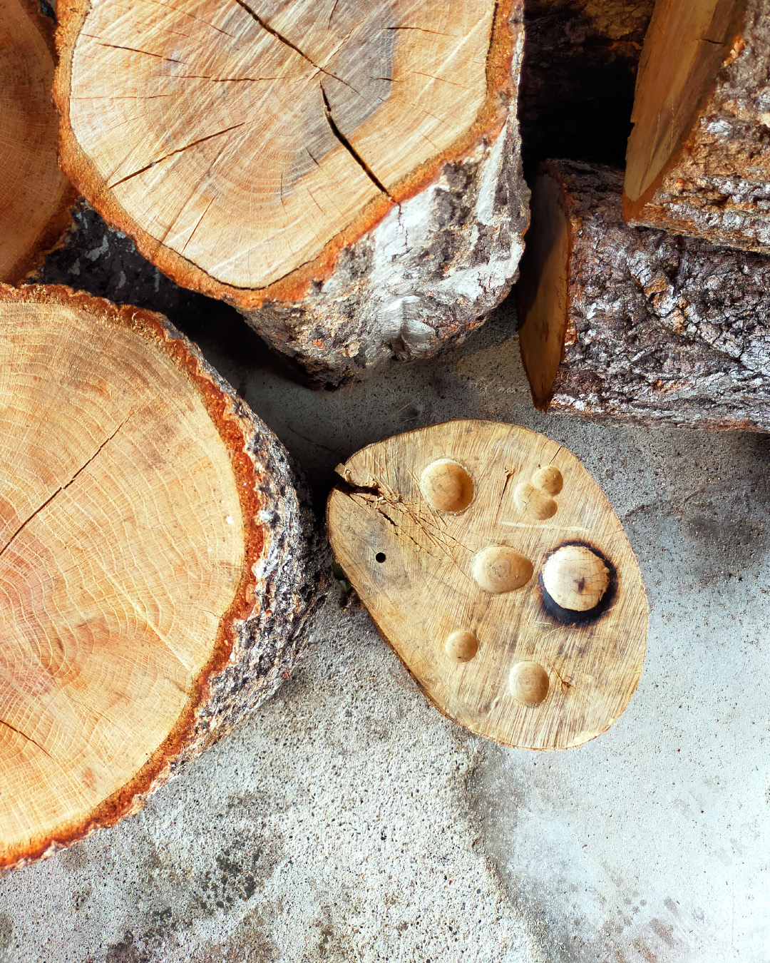 玉切りの木の断面に大小様々なくぼみを見つけた。