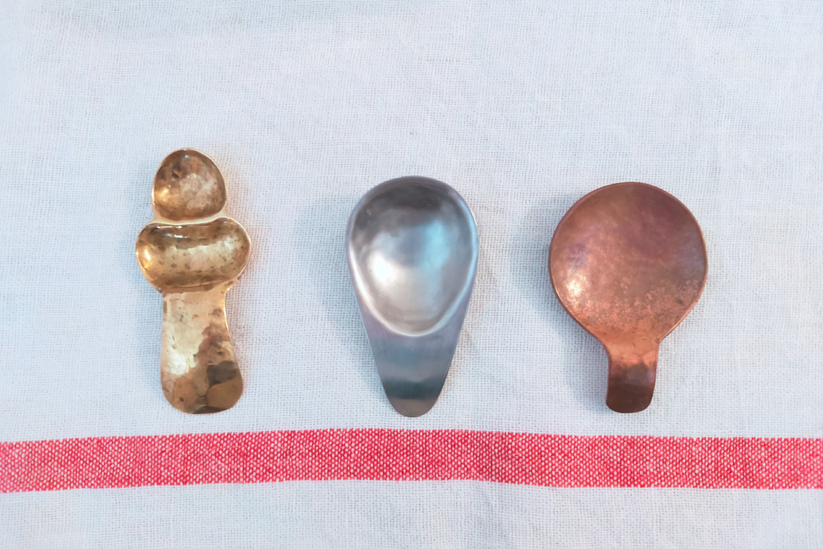 くぼみから出来上がったものは、くぼみを型にして地金を流し込んで作ったスプーン。コーヒー豆を計量したり、おつまみに添えたりといい活躍っぷり。