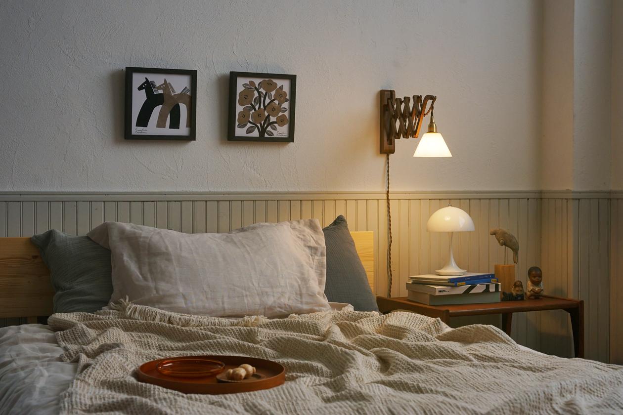 寝室の照明を変えるなら、間接照明など抑え目の明かりでも十分。そこに読書やデスクワークをするためのコーナーがあれば、手元をしっかり照らすためのライトで補おう。