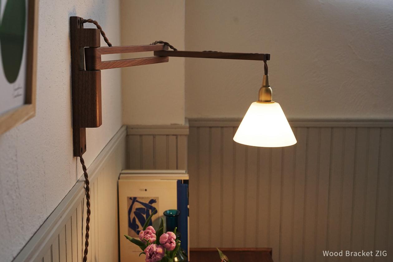 小坂さん「当社で扱っている『Wood Bracketシリーズ』は、可動式のアームが付いたブラケットライトです。テーブルやカウンターなど、場所の用途に合わせて光の位置を調整することができて便利。アームの形や木目によって表情が変化するのもポイントです」