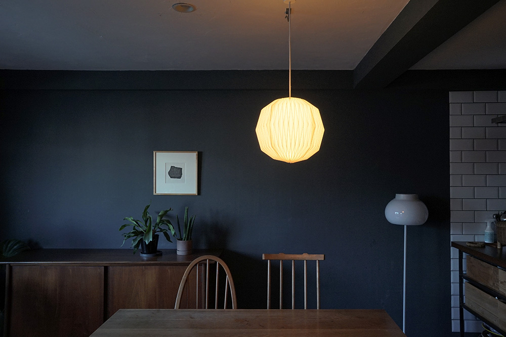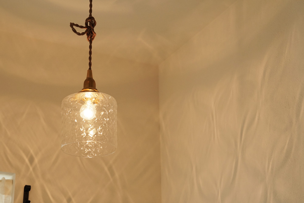 小坂さん「照明演出を楽しみたいなら、狭い空間のほうが光の効果を発揮しやすいです。写真のペンダントライトのように、凹凸のあるガラスシェードは壁や天井に柔らかな陰影を映し出します。壁が近いと模様がキレイに出せるので、トイレやディスプレイコーナー、廊下の一角などにおすすめ。新築やリフォームで照明を取りつける際は、あえて壁寄りに照明器具を設置すると、長めのコードにしても邪魔になりません」
