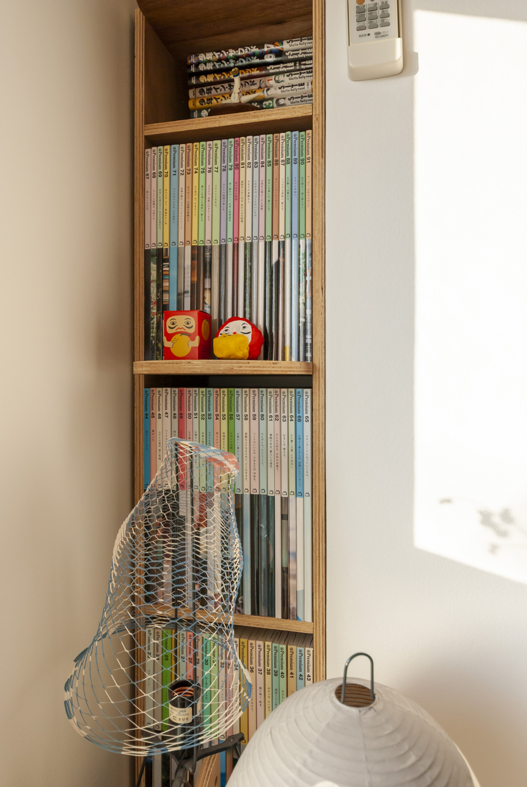 柱と壁の間に少しだけ空いていた隙間にも寸法をきっちりと合わせて作った棚を置いて活用(提供:studio juna)