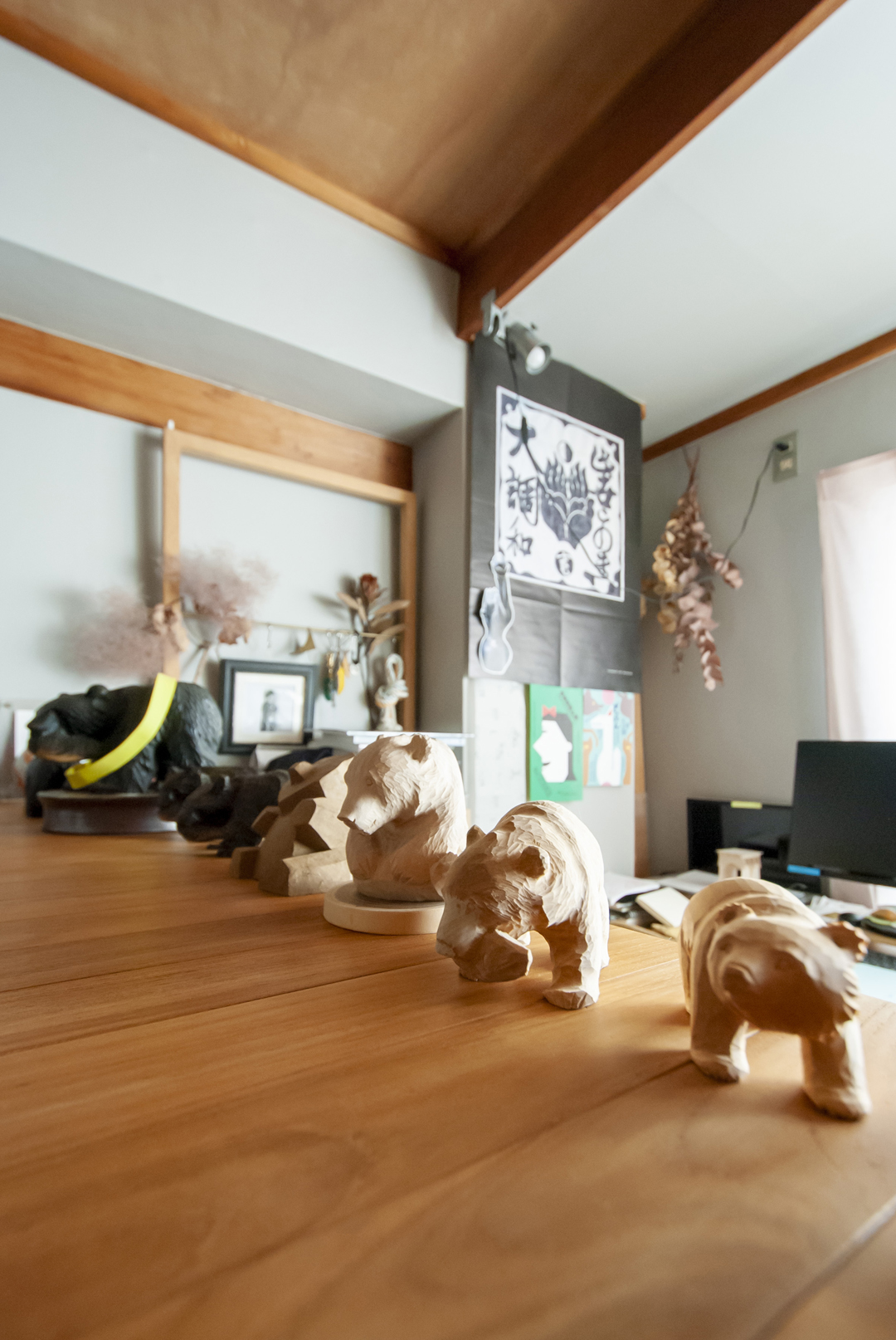 仕事空間に並ぶ木彫りの熊はご夫婦共通で好きなもの。熊の下に敷いている木の板は仕事で取り寄せたサンプル。(提供:studio juna)