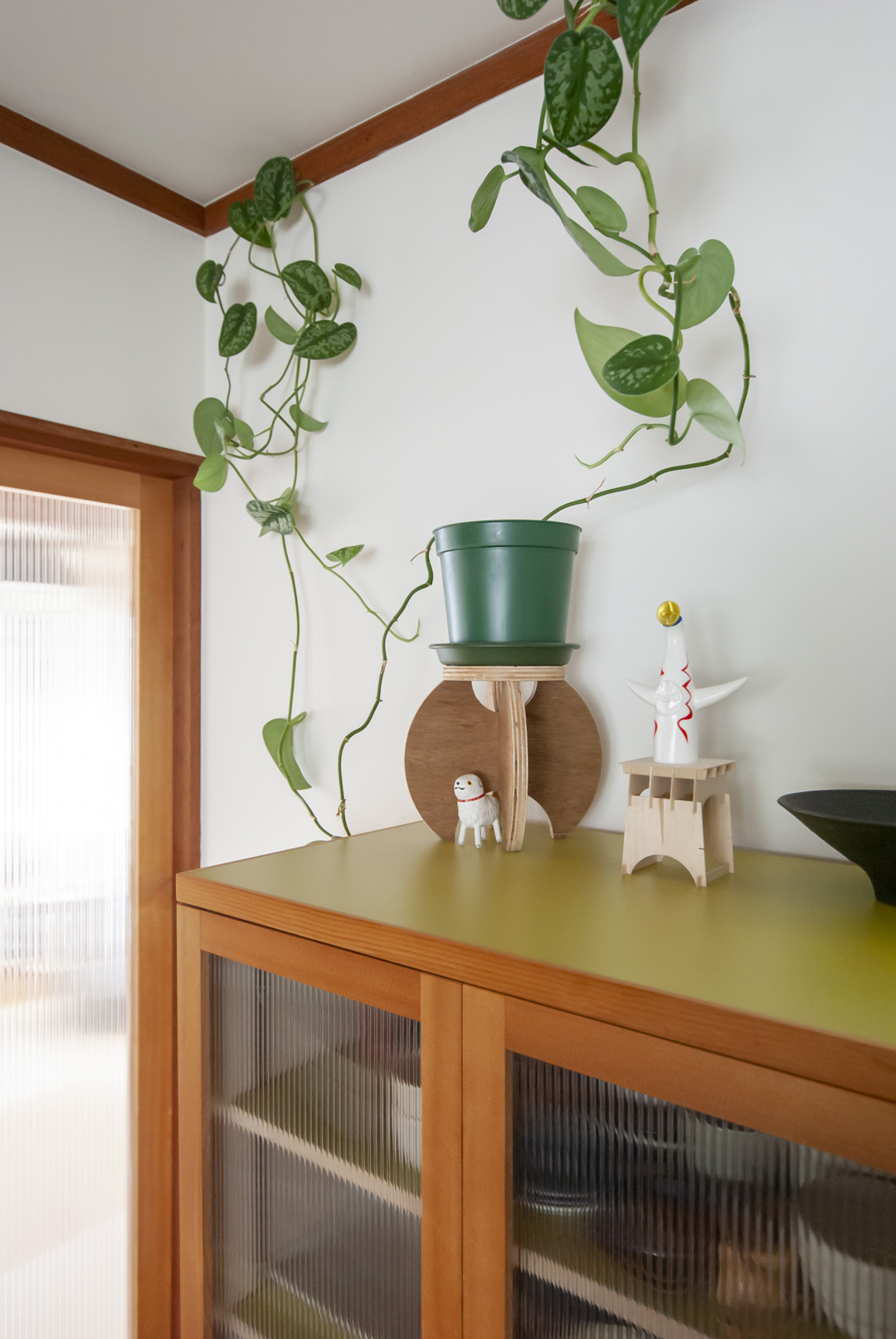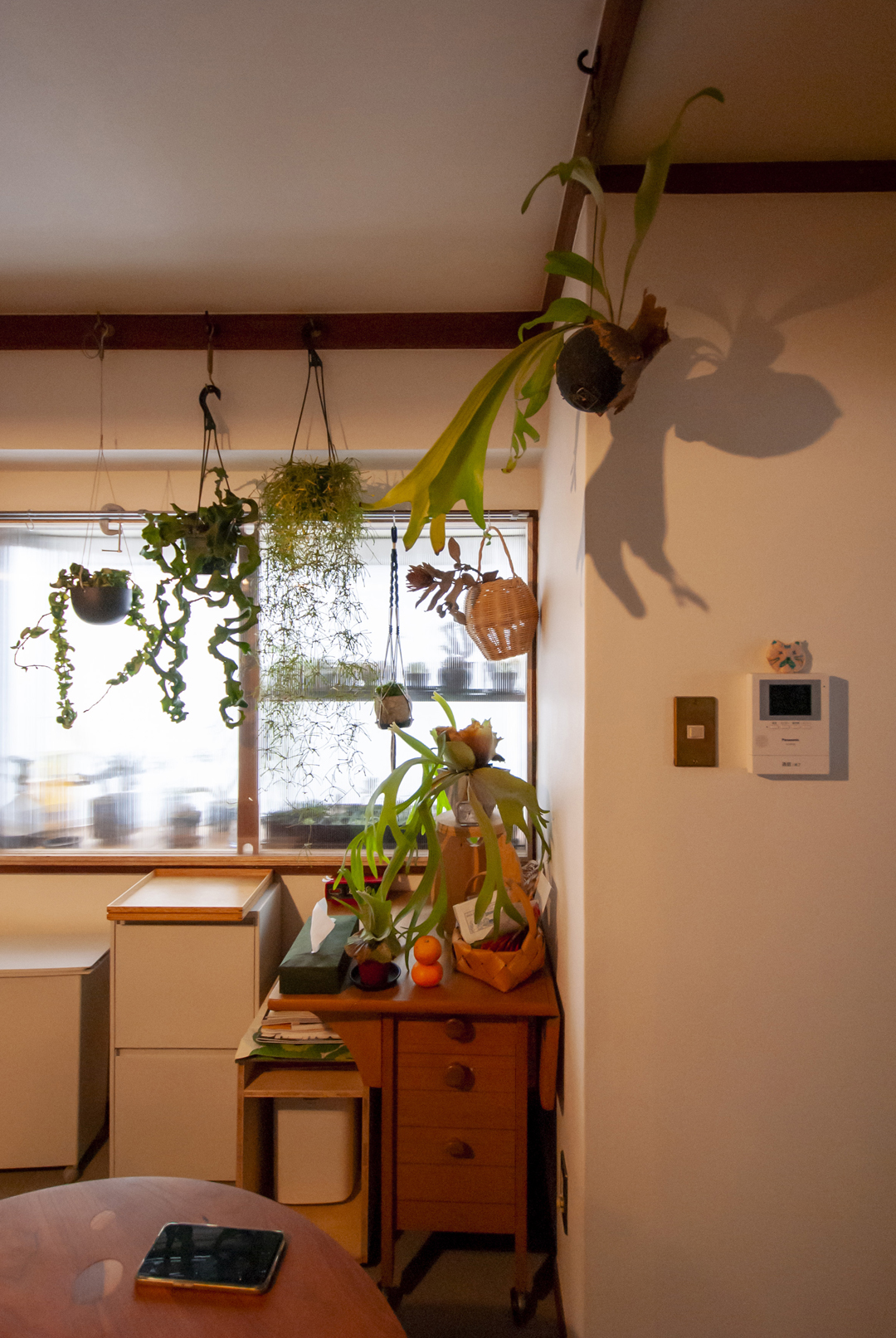 目にうつるほとんどの場所は手を加えられているのだけれど、自作の品や趣味で集めている民藝品・フィギュアなどのアイテムと、既製品の家具・築40年以上のアパートの各パーツとのバランスが取れていて、それぞれの場所に落ち着いて馴染んでいる。