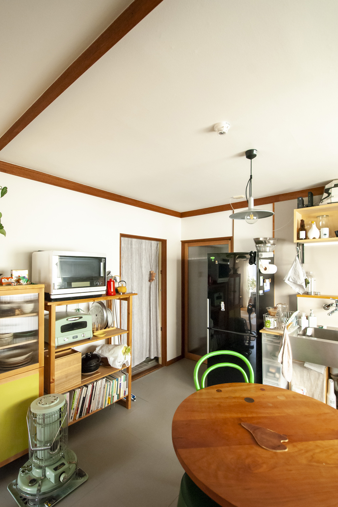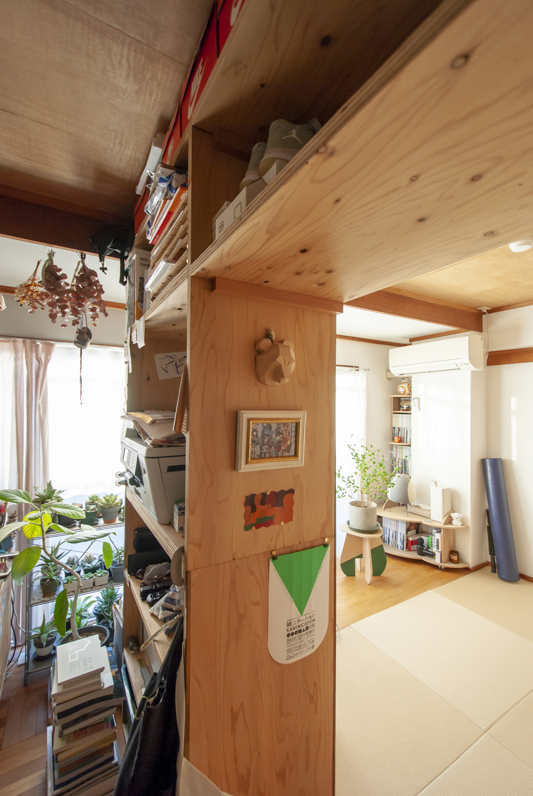 「壁を取ったりとかはしてなくて、間取りは変わっていません。ダイニングの床はしばらく元々の木目のクッションフロアのまま住んでいたけど、テーブルを作った時に合わなくなったのでフロアタイルを敷いて。あとは、寝室の畳を変えて全体的にクロスを貼りかえて、天井にラワン合板を張って、キッチンを変えたりしました。退去時に持って行けるように、どこの床材も敷いているだけ。ダイニングの棚は1つは自分でデザインして作ったけど、横にあるのはだいぶ昔に買った既製品の棚です。外した既存の建具は保管しています」