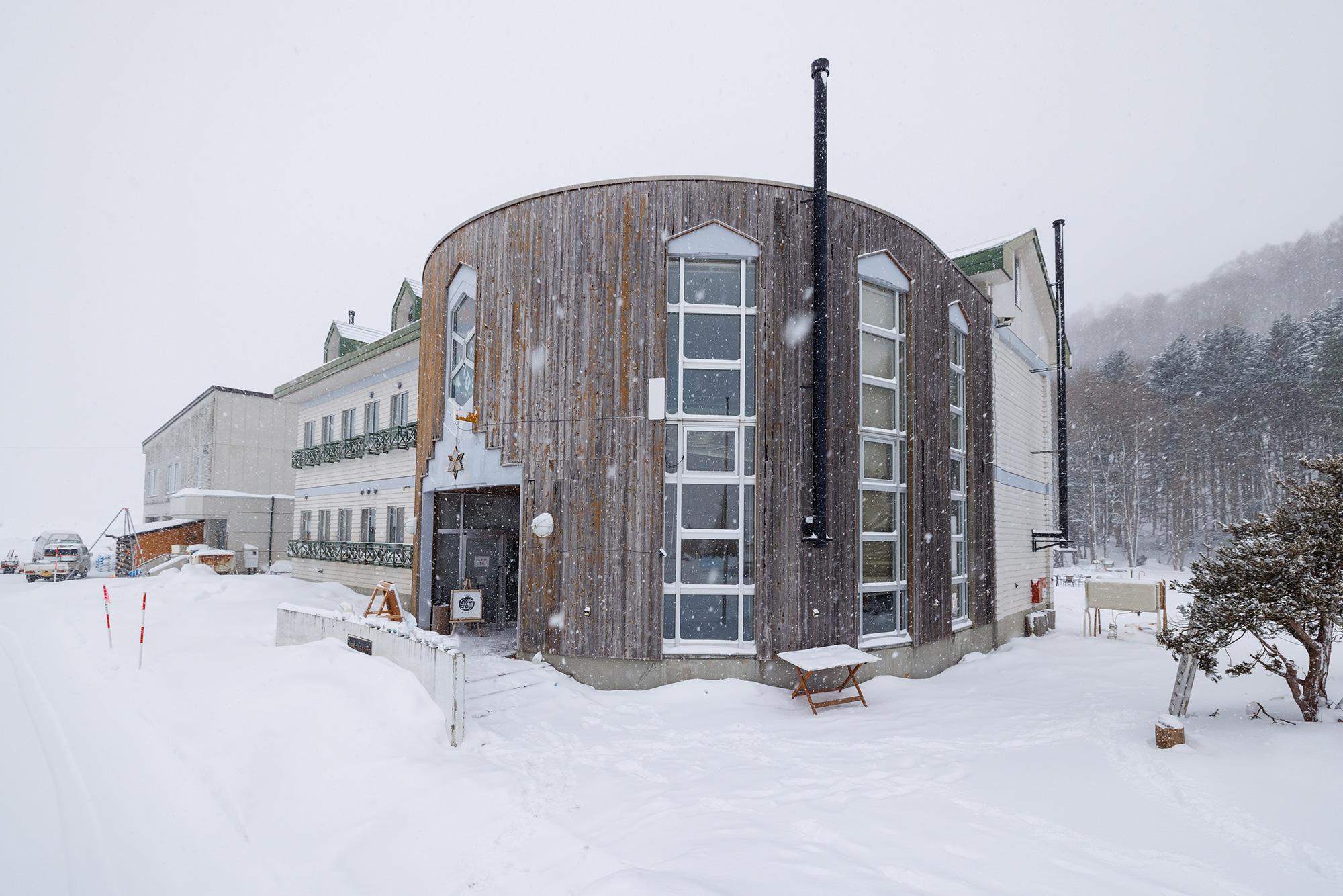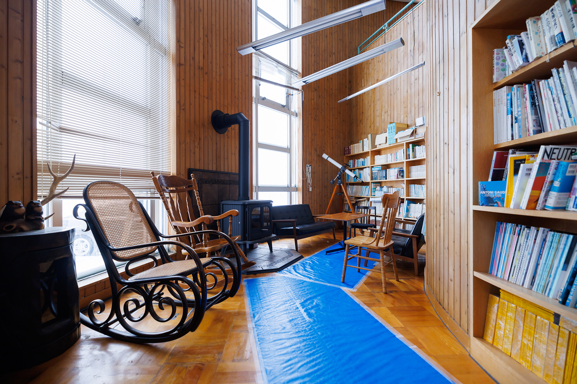 外観の丸い部分の内部は図書室。冬の間はブルーシートで床を保護している。(写真:川原亮)