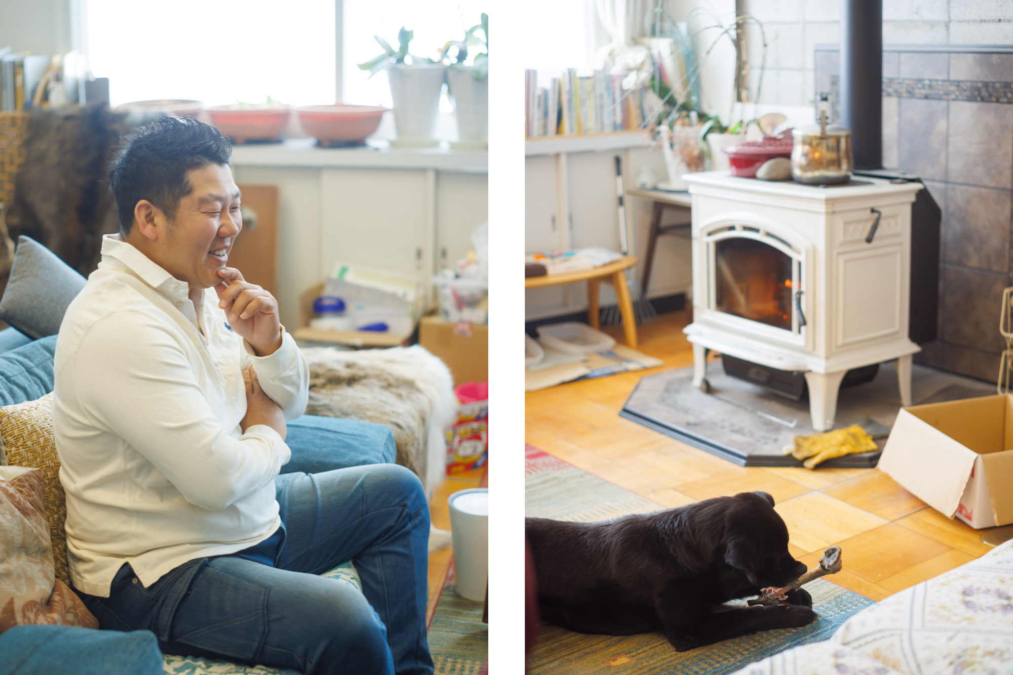 吉田鉄平さんとエゾシカの骨をかじるクマノスケ。暖炉の薪は所有する山から調達している(写真:川原亮)