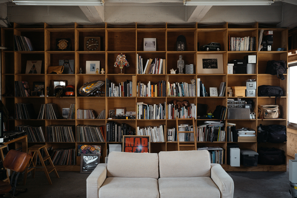 オフィスと住居を仕切る大きな本棚には、仕事道具と趣味のあれこれが混在して並んでいる。